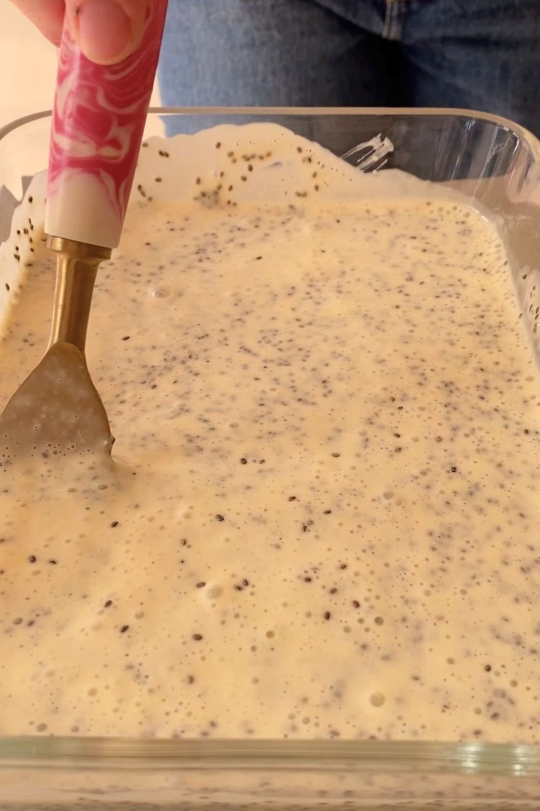 - Pour into a medium size mixing bowl. Add chia seeds. Stir to combine. Rest for 5 minutes, then stir again, breaking apart any clumps.
